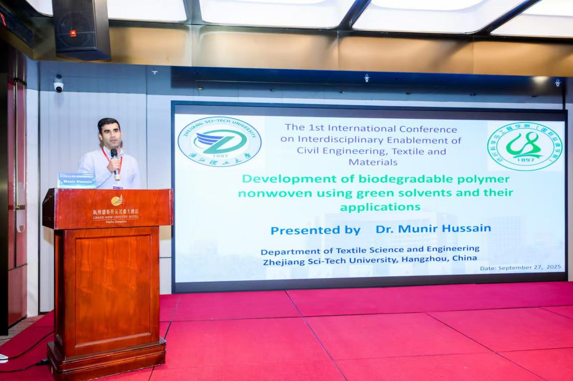 在会议报告环节,来自中国、巴基斯坦、英国、日本等国家的学者,围绕“功能纺织品制备与前沿应用”、“自供电纺织传感器设计与制备”、“蛋白质纤维加工与应用”、“可生物降解非织造材料加工”、“水凝胶制备及应用”、“电磁屏蔽用柔性纤维研究进展”、“运动用功能纺织材料制备”、“液晶光子晶体在纺织中的应用”等议题,分享了最新研究成果。现场学术氛围浓厚,研究生们踊跃提问,互动积极。