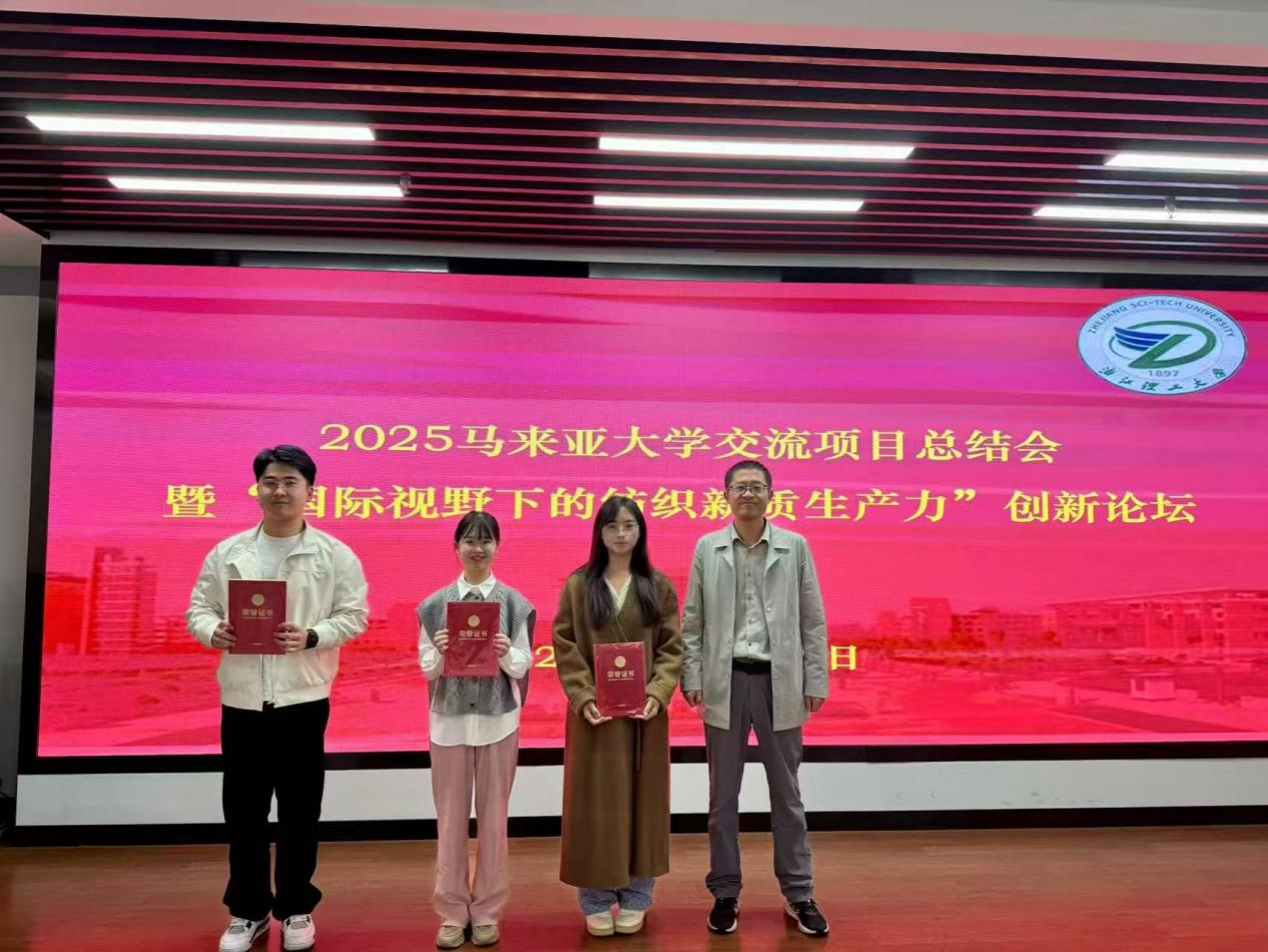 表彰环节过后,进入2025马来亚大学交流项目总结会环节。三个月项目的硕士生李智宇、一个月项目本科生梁晶晶及硕士生余夏杰分别就马来亚大学的语言环境、风土人情及成长蜕变等方面做了分享。