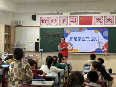 “同学们,你们身上穿的衣服,桌上的桌布,都是由一根根细小的纱线交织而成的。那么,这些布究竟是怎么形成的呢?”活动伊始,志愿者以一个贴近生活的问题点燃了孩子们的好奇心。随后,通过图文并茂的课件、生动有趣的动画演示以及真实的纱线样本展示,志愿者系统讲解了从天然纤维到纱线、再到织物的完整纺织流程。深入浅出的讲解不仅让孩子们理解了纺织作为一门生活技艺的价值,更让他们认识到其在推动人类文明进程中的科技意义。