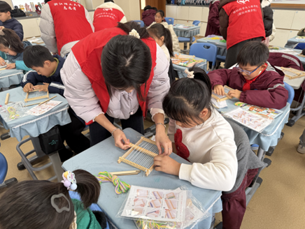 在实践环节,孩子们分组操作简易织布机,在志愿者的指导下亲手完成穿纬、打筘、引线等基础织造步骤。一块块色彩斑斓的小织物在稚嫩手中逐渐成形,孩子们不仅直观体会到“经纬交织”的工艺逻辑,更在指尖触摸中感受到传统技艺背后的匠心与智慧。